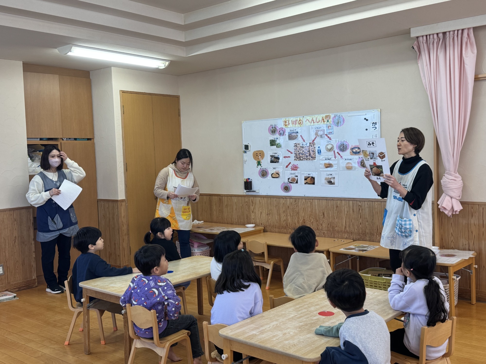 給食の先生たちが幼児クラスに向け、食育講座を行いました。テーマは「大豆の大変身」。子どもたちにとっても身近な食材ですが、実はどんなふうに姿を変えて、毎日の給食に登場しているのかを教えていただきました。