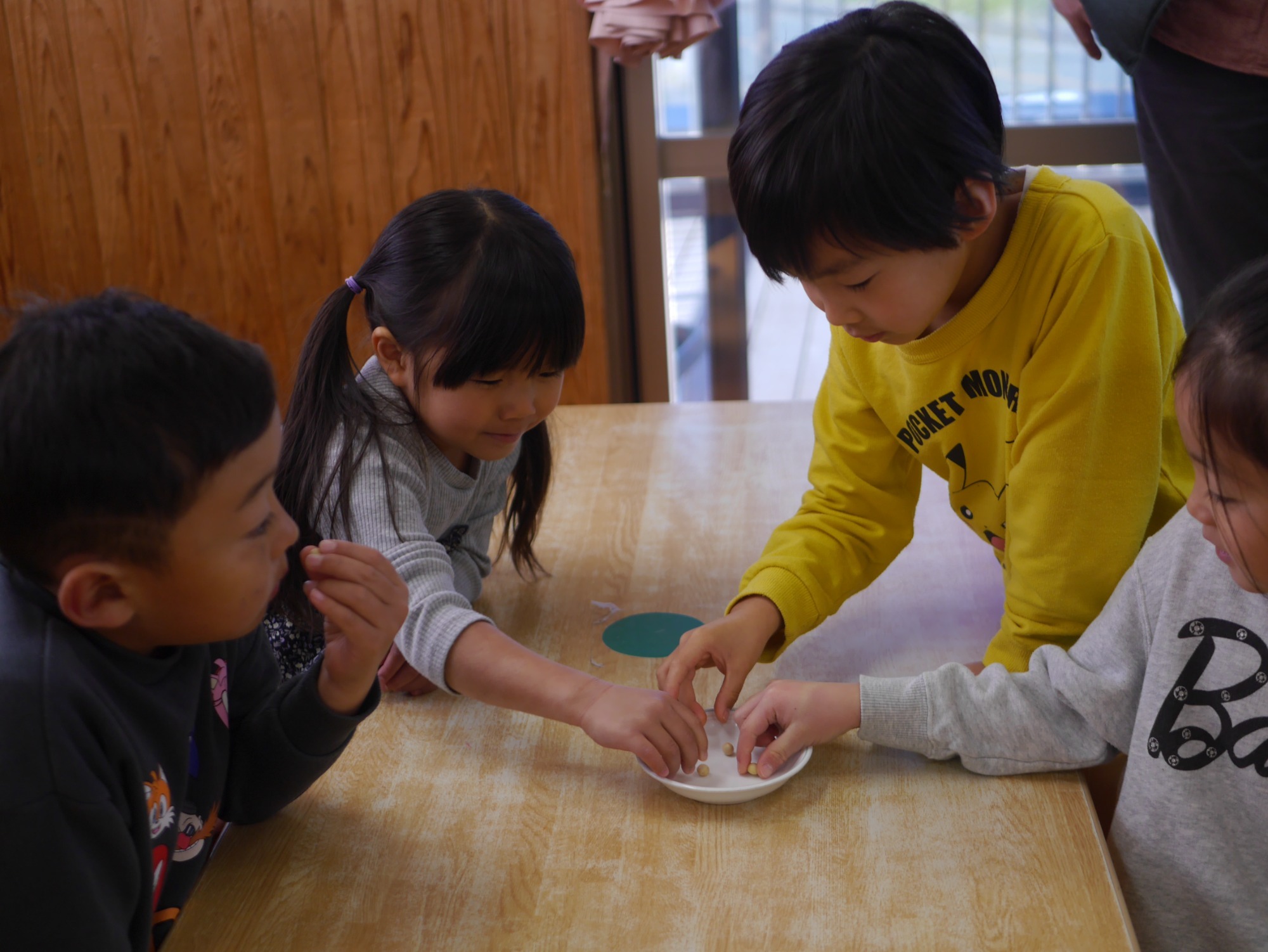 茹でる前の大豆に触れてみたり、大豆がどんな食べ物に変身するのかのお話を聞いたりしました。豆腐、みそ、しょうゆ、きなこ…子どもたちは話を真剣に聞きながら、「知ってる!」「給食で食べたことあるよ」と嬉しそうに反応していました。