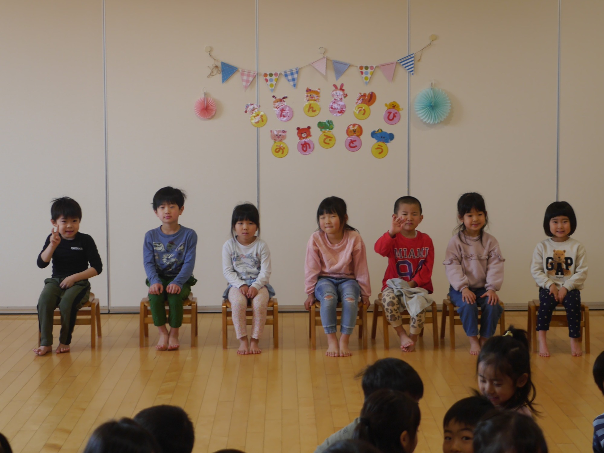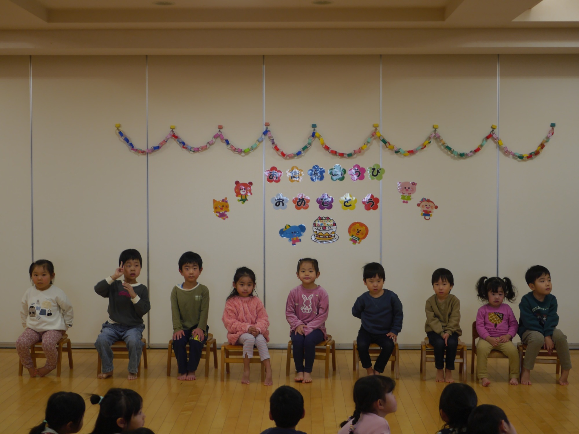 みんなの前に並んだ誕生者の子どもたちは、少し緊張しながらも、自分の名前や好きなものをしっかり発表していました。お祝いの歌が始まると、照れた様子もありましたが、笑顔で手を振ったり、一緒に歌ったりして様々な反応を見せていました。