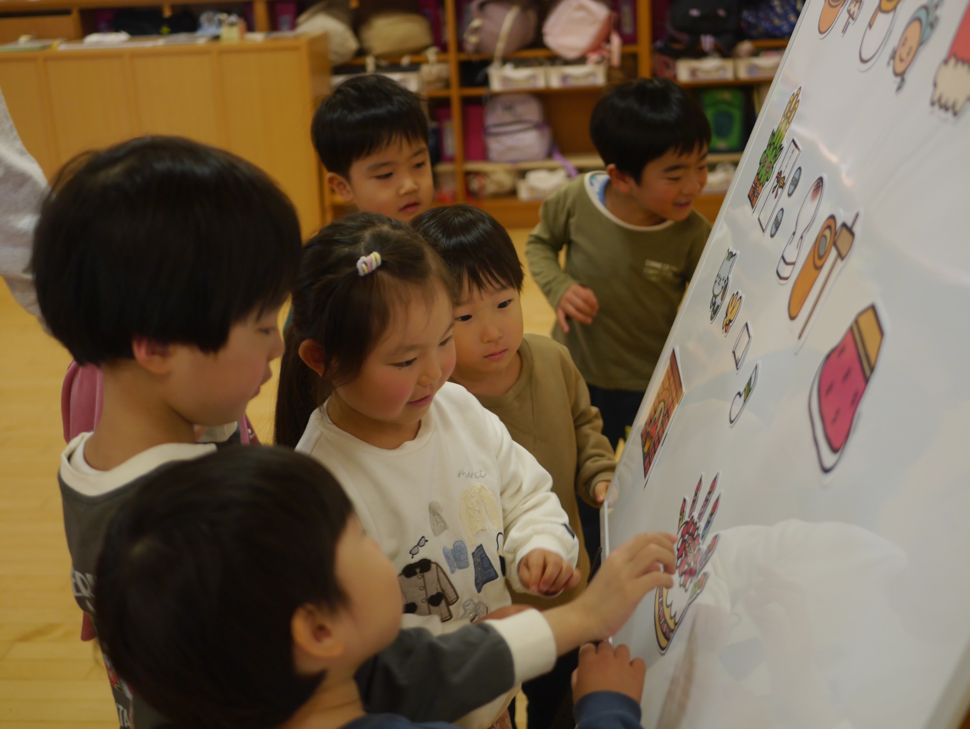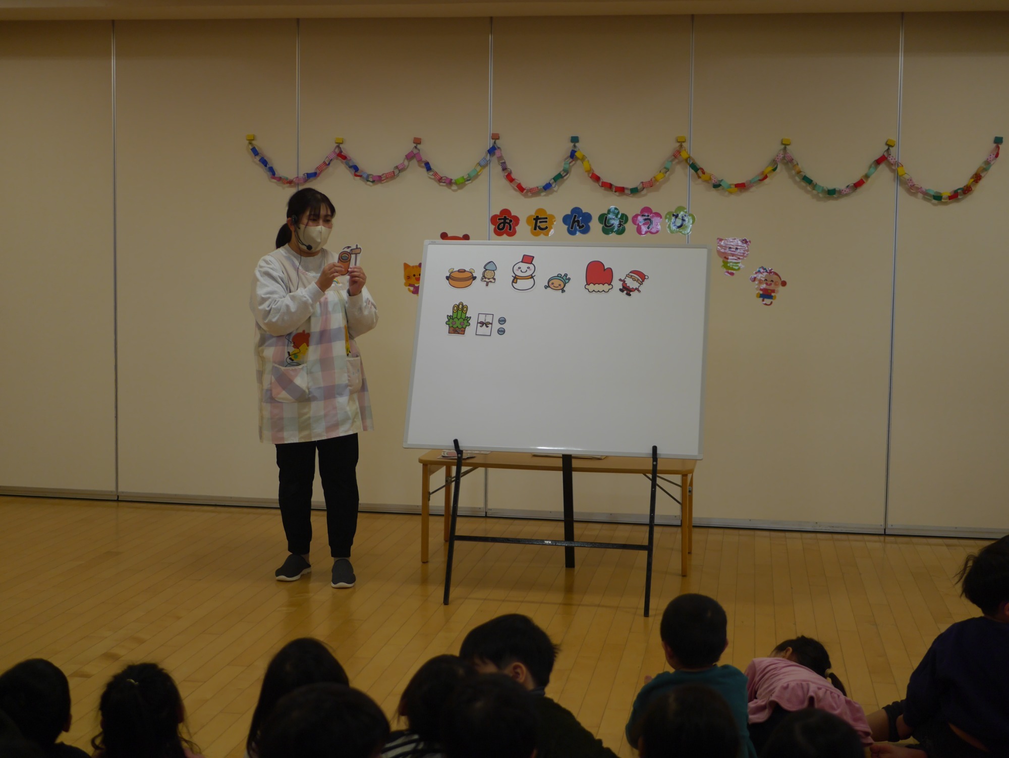 職員の出し物も大盛り上がり。幼児クラスには「冬のかくれんぼ」のマグネットシアターでした。雪だるまや手袋など、冬ならではのものがひょっこり隠れていて、少しだけ見えるヒントを見つけると「わかった!」「あれだ!」と口々に答えが飛び出し、子どもたちのワクワクが止まりませんでした。