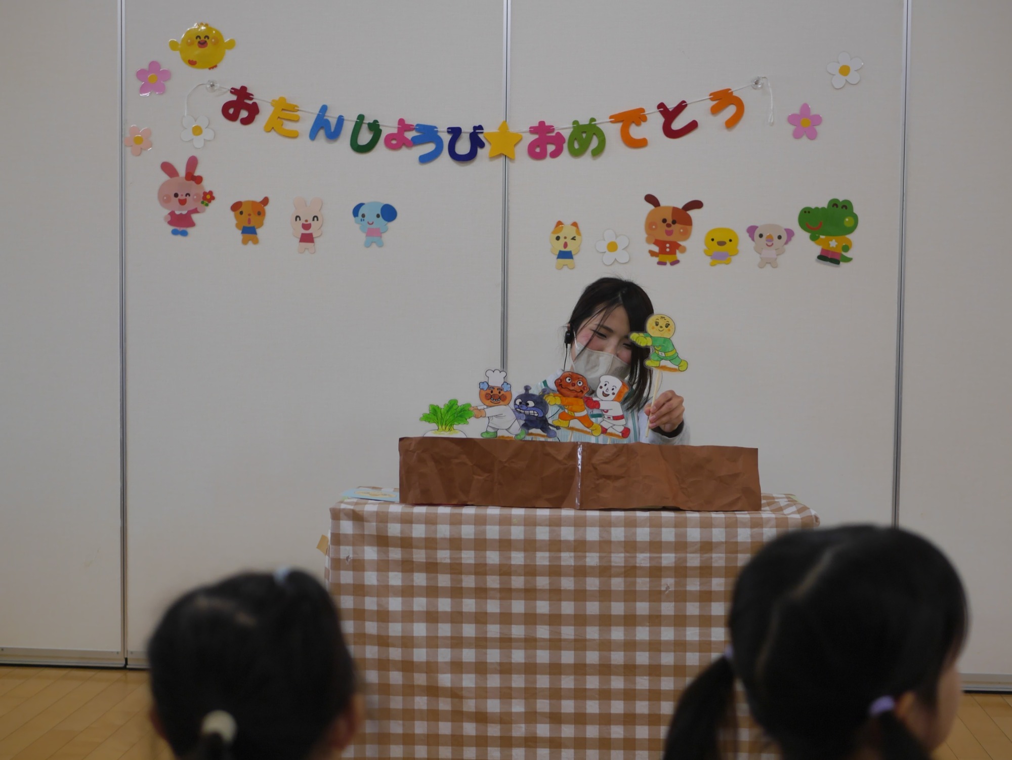 乳児クラスでは「大きなかぶ」のペープサート。かぶを引っぱる出演者がアンパンマンたちに変身して登場すると、「アンパンマンだ!」と大喜び。みんなで力を合わせて「うんとこしょ、どっこいしょ」と声を合わせ、夢中になって楽しんでいました。