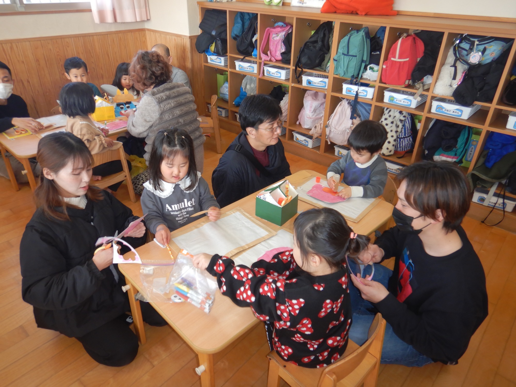 もも組は、節分に向けて鬼のお面づくりを親子で行いました。色を選んだり、パーツを貼ったりしながら「どんな鬼にしようかな」と相談する姿がとても可愛らしく、世界にひとつだけの素敵なお面が完成しました。
