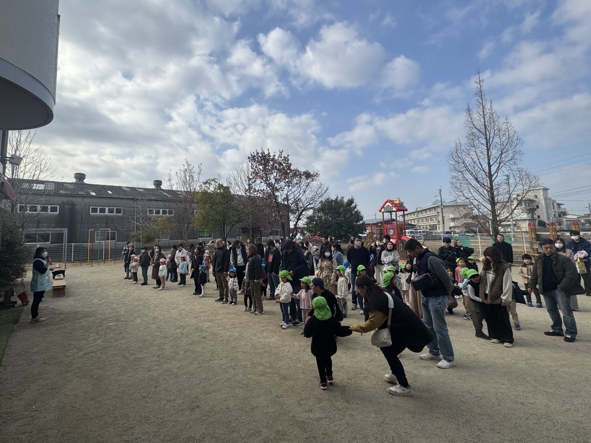幼児クラスの保育参観を行いました。登園後は、まず園庭でいつものように遊ぶ子どもたちの姿を保護者の皆さんに見ていただきました。砂場や遊具でのびのびと遊ぶ様子は、普段の生活そのまま。おうちの方に見守られながらも、子どもたちはいつも通りの表情で楽しんでいました。