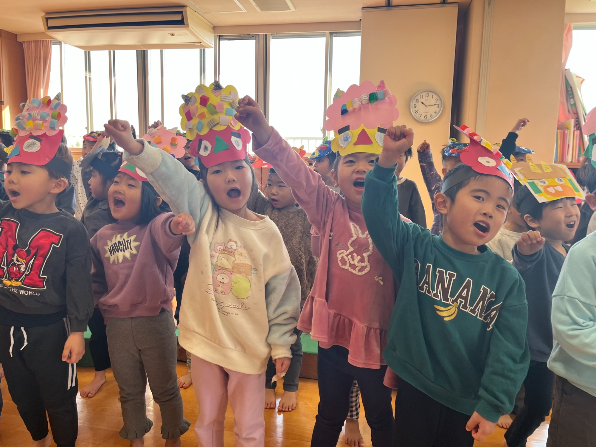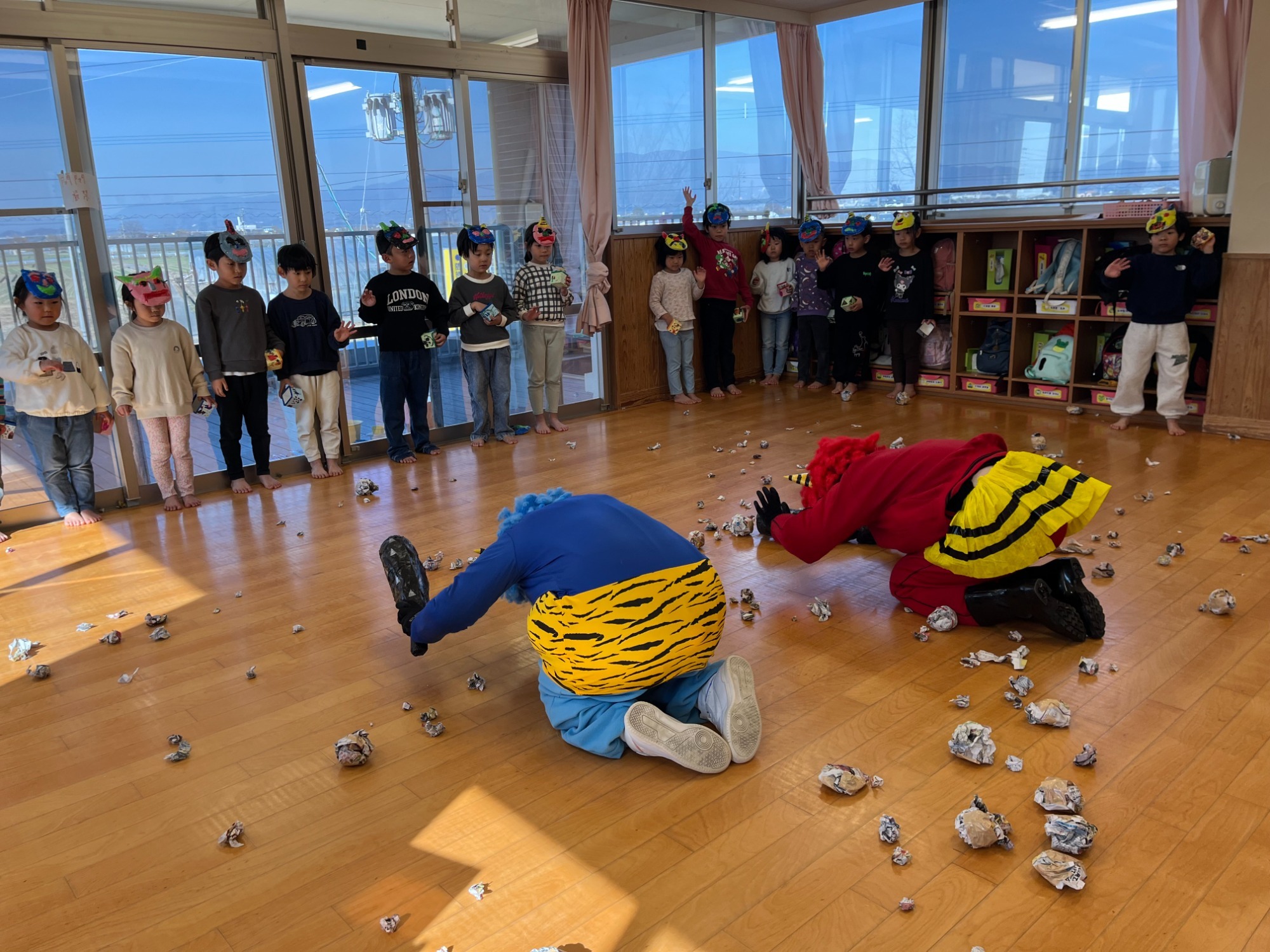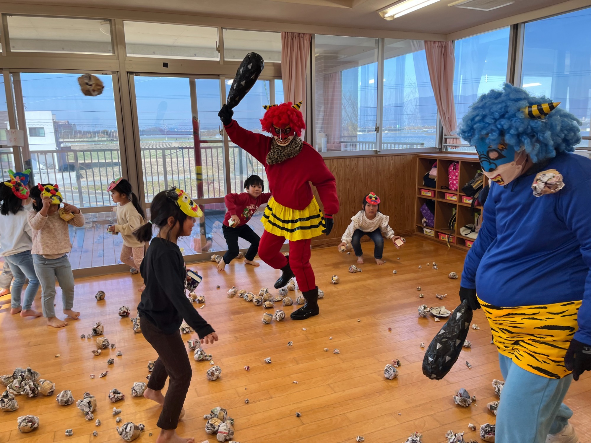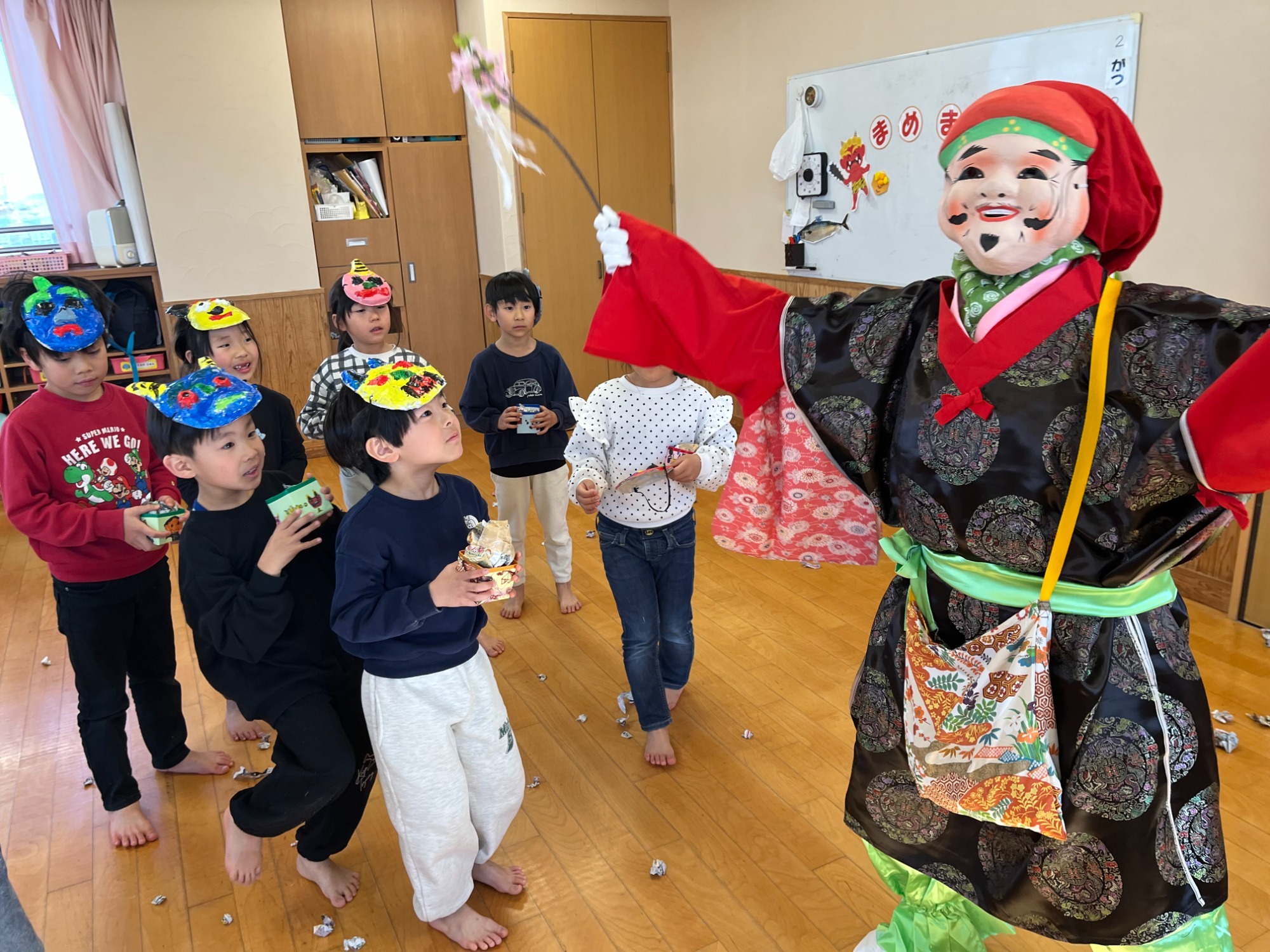 初めは驚いていた様子の子どもたちでしたが、事前練習の成果を発揮して、「おにはそと!ふくはうち!」 と、元気いっぱいに豆(に見立てたボールや、新聞紙)をまいて、鬼をやっつけました。 最後は鬼が「ごめんなさい」と謝り、子ども達も「いいよ」と優しく仲直り。 すると、福の神がにっこり登場し、春の訪れを知らせてくれました🌸