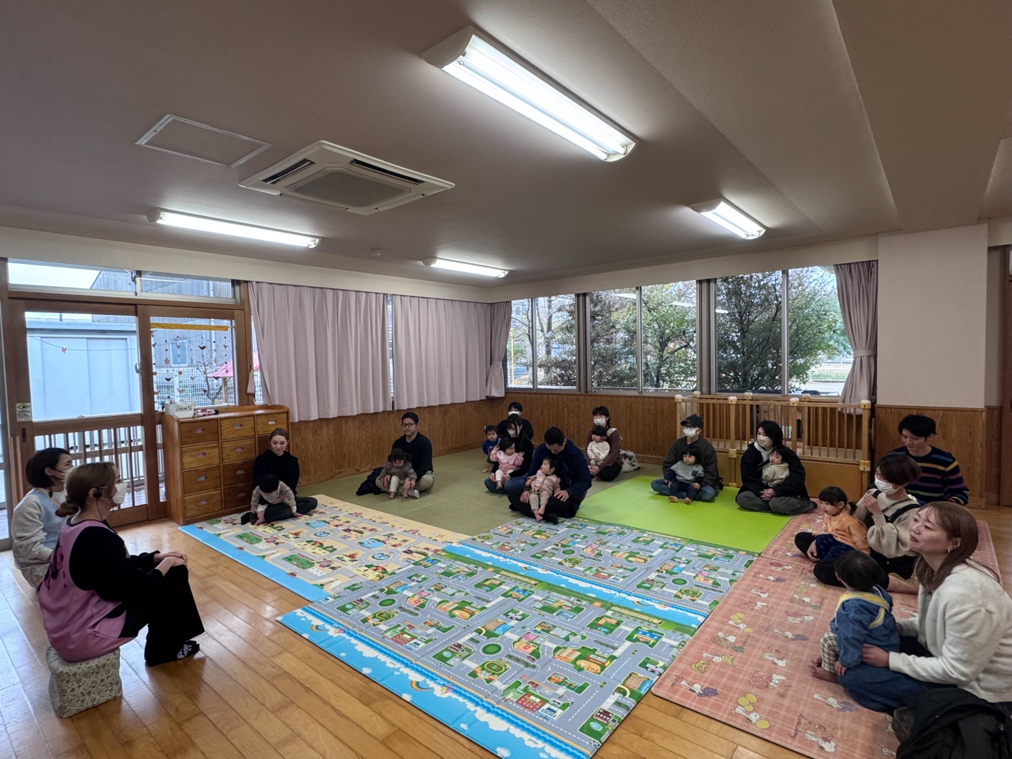 乳児クラスの保育参観を行いました。おうちの方と一緒に、いつも楽しんでいるお集まりに参加していただき、手あそびやふれあい遊びを通して、子どもたちの笑顔や成長した姿を見ていただきました。