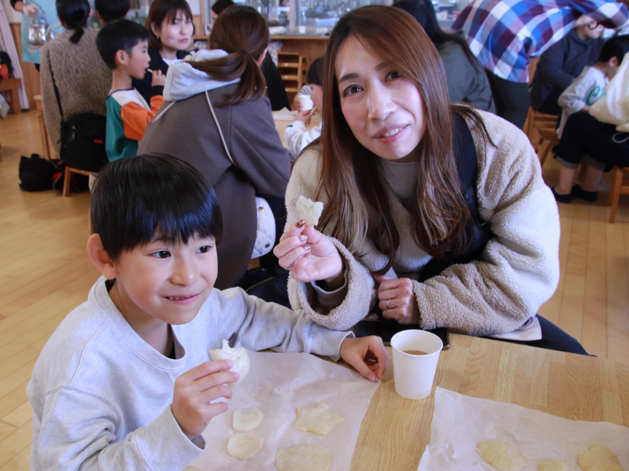 きく組は親子クッキングで「もち米せんべい」作りに挑戦。もち米をつぶし、形を整え、好きな調味料を入れて、親子で協力しながら作りました。焼き上がる香ばしい匂いに子どもたちも嬉しそうでした。