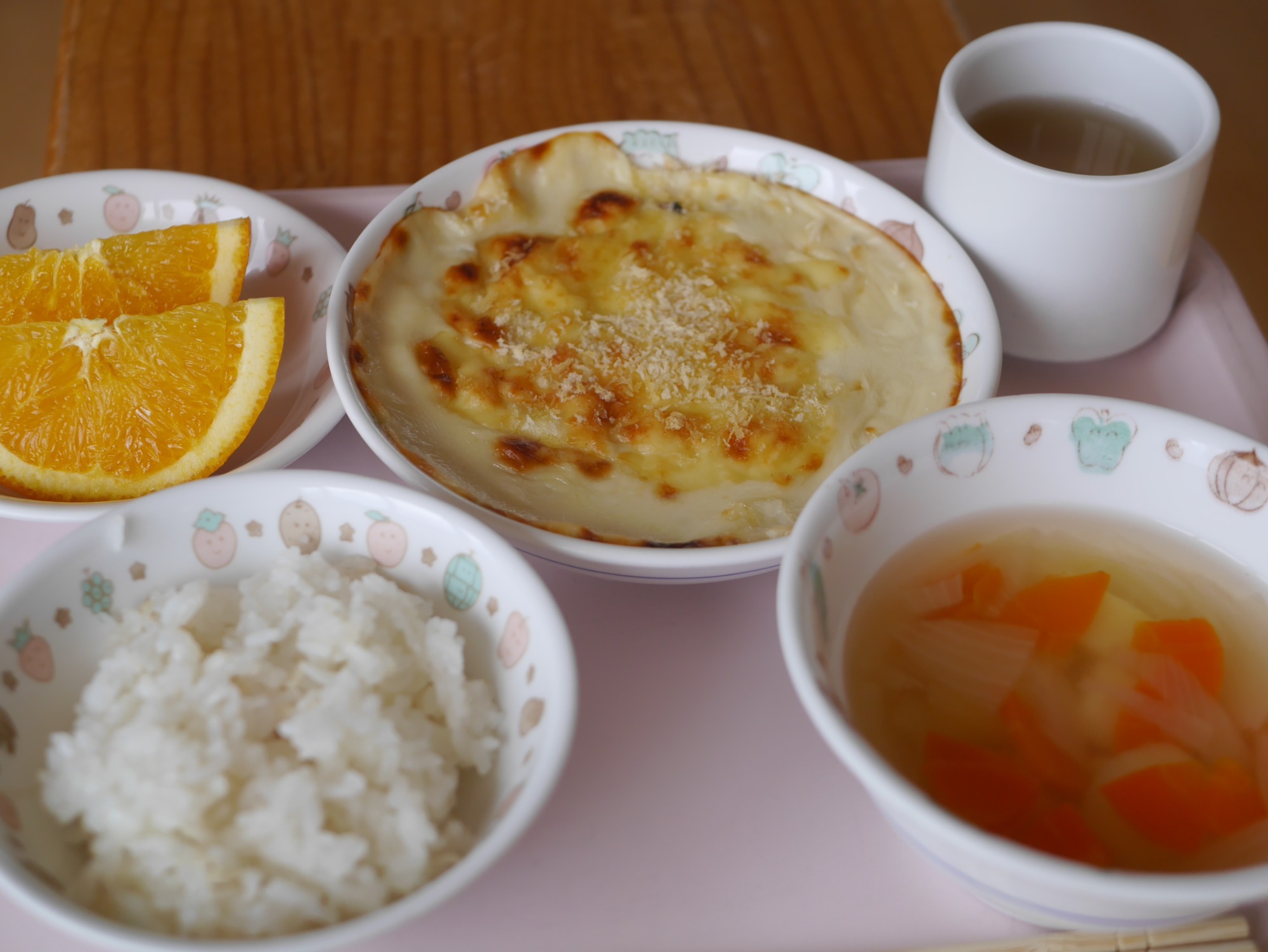 卒園を間近に控えた年長児クラスの子どもたちに、「一番好きだった給食はなに?」と聞いて、思い出を振り返りながら話し合った結果、選ばれたのは——みんな大好きな「グラタン」と「野菜たっぷりのスープ」!