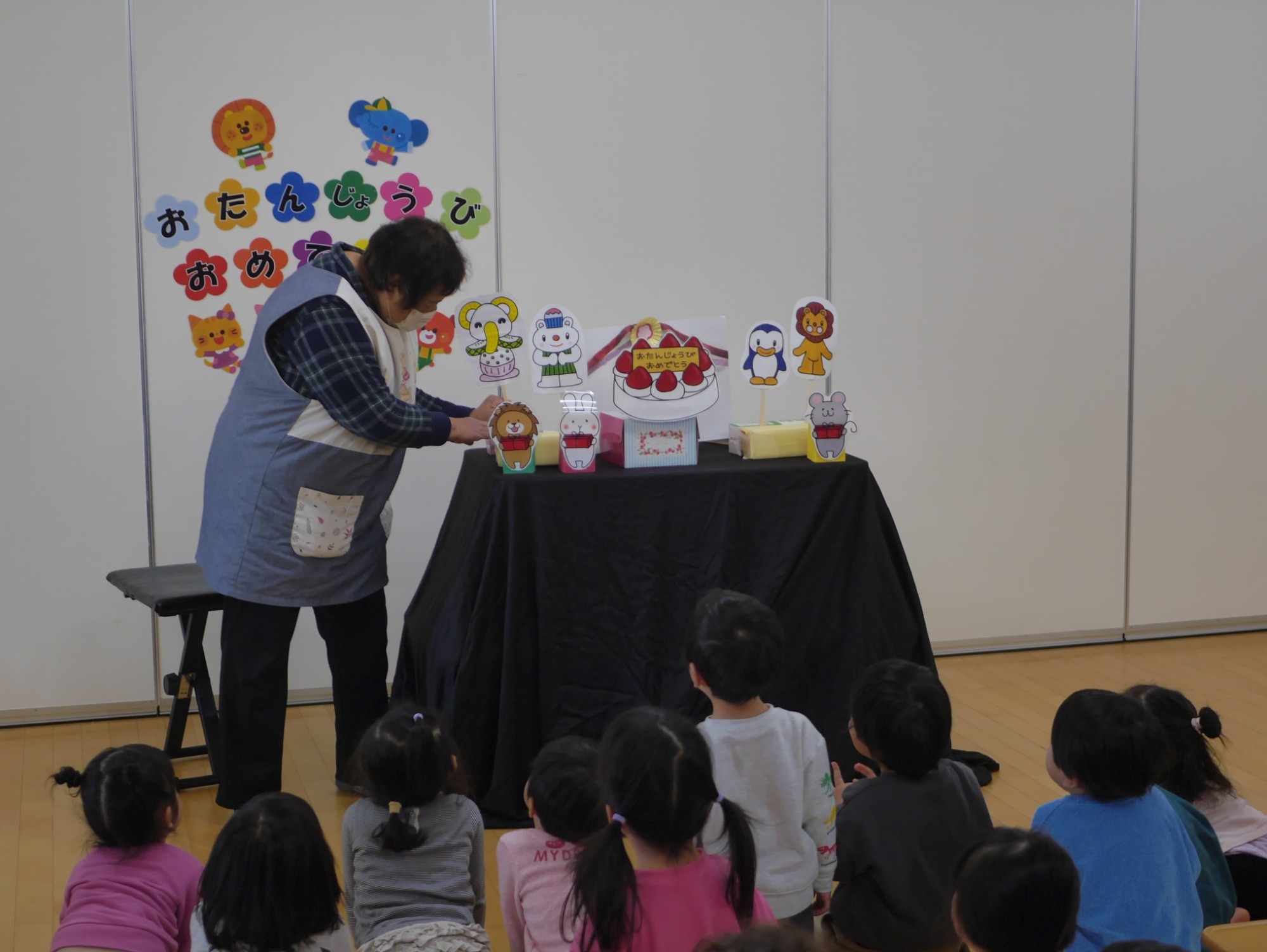 乳児クラスでは、動物さんたちが楽しいプレゼントを持ってきてくれるお話。みんなで力を合わせて、大きなケーキを作り上げてくれました。完成したケーキが登場すると、「わあ〜!」と歓声があがり、にっこり笑顔が広がりました。