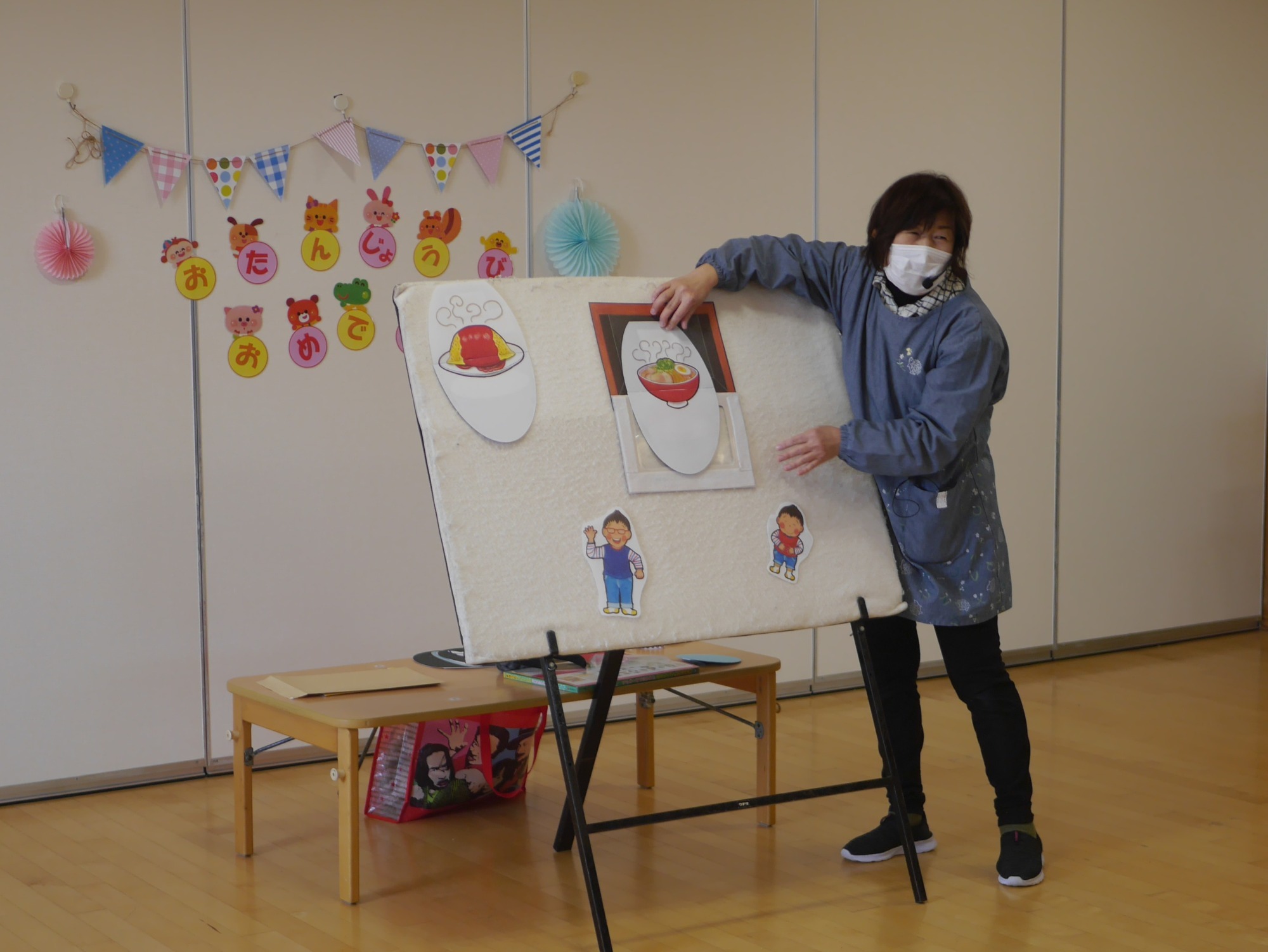 幼児クラスの出し物は、パネルシアター「まほうの電子レンジ」。空っぽのお皿をレンジに入れて「チン!」とすると…あら不思議!おいしそうな食べ物が次々と現れて、子どもたちは大喜び!「次はなにが出てくるのかな?」とワクワクが止まりませんでした。
