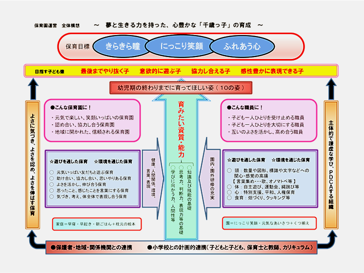 「子どもの最善の利益のために」を基本に、恵まれた自然環境のもと、子どもたち一人ひとりに寄り添い尊重し、子どもたちが元気で活き活きと活動できる生活の中、夢と生きる力が持てるように育てます。また、子どもたちが地域の伝統・文化を大切にし、ふるさとを愛し誇りが持てるように、保護者や地域の方々と手を携えて心豊かな人となるための基礎づくりをします。